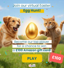 Wamiz are giving pet owners the chance to win an egg-stra special £100 Amazon voucher for FREE in their fun Easter Egg hunt game! Simply click below and add your details, then just catch the Easter eggs and to aim for the highest score.